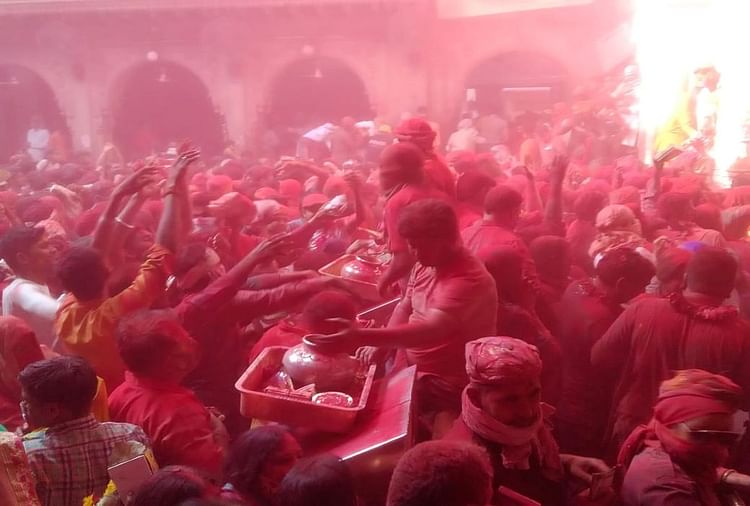 बांकेबिहारी मंदिर में होली खेलते भक्त