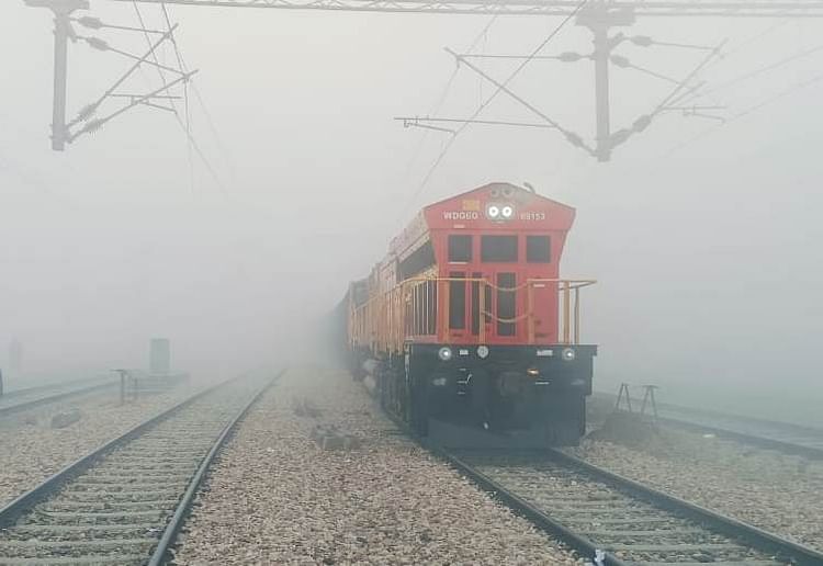 सुबह के समय घने कोहरे में जंक्शन से गुजरती ट्रेन। संवाद