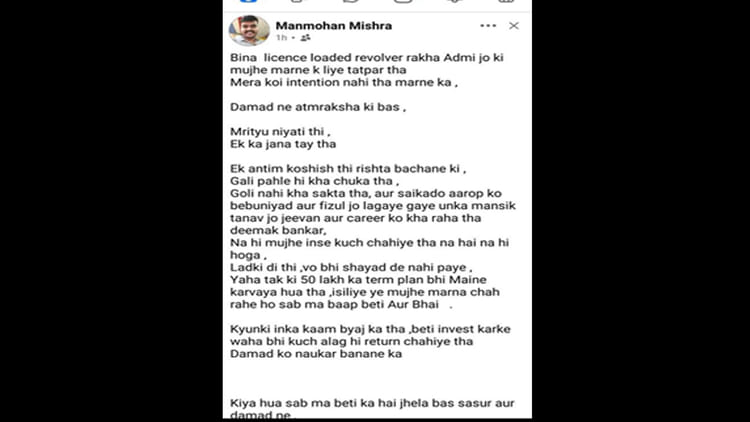 मामले में मृतक के छोटे भाई की शिकायत पर दामाद मनमोहन मिश्रा समेत छह लोगों के खिलाफ हत्या का मामला दर्ज हुआ था। अब आरोपी मनमोहन मिश्रा ने अपने सोशल मीडिया अकाउंट से एक पोस्ट की है। अशोक बाबू का नाम लिए बिना लिखा है कि बिना लाइसेंस लोडेड रिवॉल्वर रखा आदमी जो मुझे मारने के लिए तत्पर था। मेरा कोई इंटेंशन नहीं था मारने का। दामाद ने आत्मरक्षा की बस। अपनी पोस्ट में आगे लिखा है कि एक अंतिम कोशिश थी रिश्ता बचाने की। गाली पहले ही खा चुका था। गोली नहीं खा सकता था।