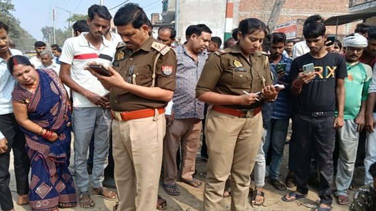 घटनास्थल पर जांच करती पुलिस व लगी लोगों की भीड़