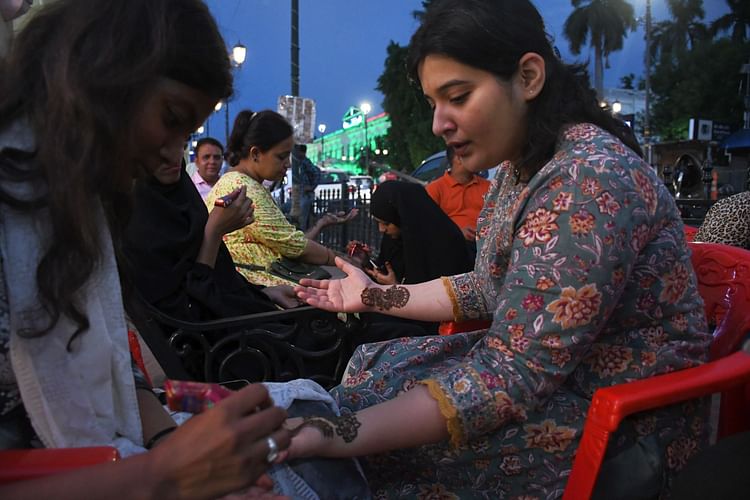 महिलाओं ने रचाई मेहंदी।