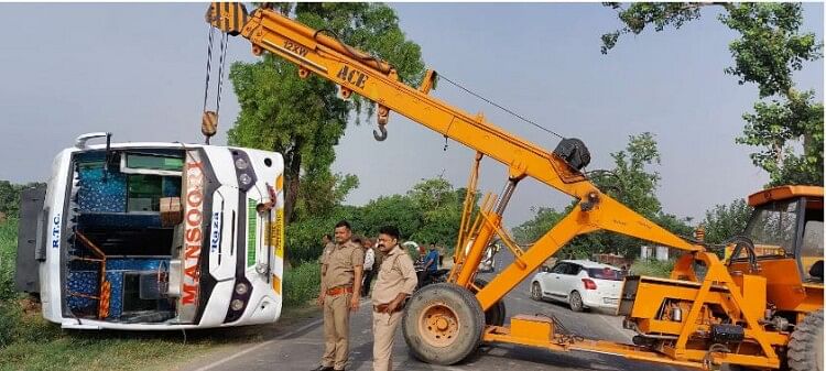हाथरस रोड पर पलटी निजी बस को हटाती क्रेन