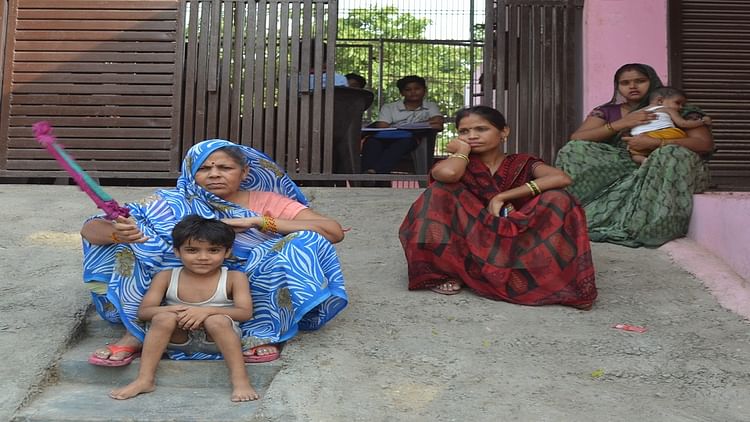 घर के बाहर बैठकर बच्चों की हाथ के पंखे से हवा करती वृद्धा