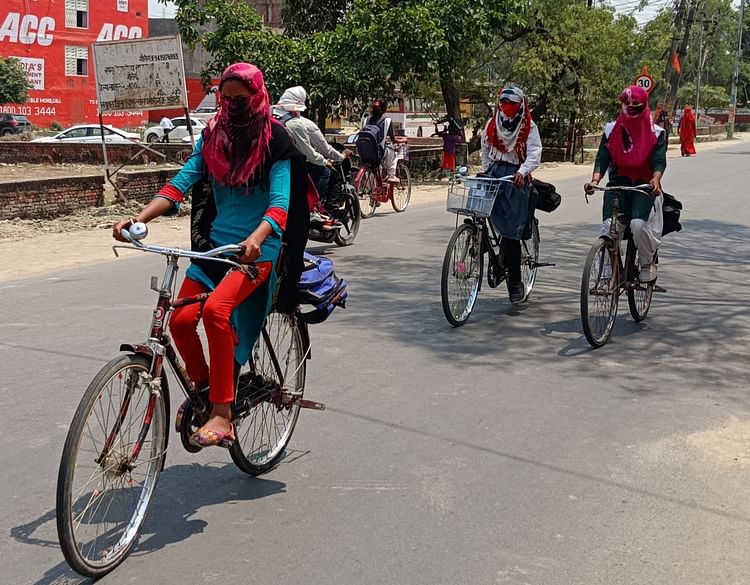 धूप से बचने के लिए छात्राएं स्टोल से मुंह ढककर जाती हुईं।