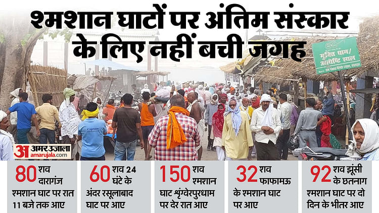 तीन दिन से देश में सर्वाधिक गर्म रिकॉर्ड किए गए प्रयागराज में श्मशान घाटों पर अंतिम संस्कार के लिए जगह नहीं बची। शृंग्वेरपुर धाम श्मशान घाट के रास्ते शव लेकर आने वालों की भीड़ से पैक हो गए। वहां दो पहिया वाहनों को खड़ा करने की भी जगह नहीं बची। मंगलवार को शहर और आसपास के चार श्मशान घाटों को मिलाकर 414 शवों का अंतिम संस्कार किया गया।