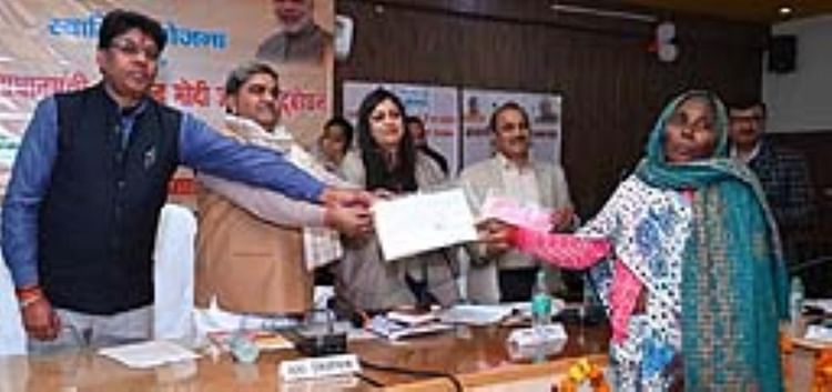 कलेक्ट्रेट सभागार में लाभार्थी को घरौनी वितरण करते भाजपा जिलाध्यक्ष केपी सिंह,सदर विधायक देवेंद