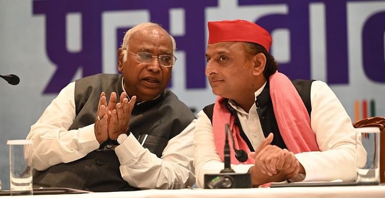 इंडिया गठबंधन की रणनीति पर संविधान का मुद्दा छाए होने की झलक साझी प्रेस कांफ्रेंस में भी दिखी। यहां मल्लिकार्जुन खरगे और अखिलेश यादव के पीछे जो बैनर लगाया गया था, उस पर महात्मा गांधी से पहले भीमराव आंबेडकर का फोटो लगाया गया था। वहीं, महात्मा गांधी के साथ ही सपा संस्थापक मुलायम सिंह यादव का फोटो लगाकर भी खास तरह के रणनीतिक संकेत दिए गए हैं। इंडिया गठबंधन के रणनीतिकार मान चुके हैं कि दलित और ओबीसी मतदाताओं के बीच संविधान का मुद्दा खूब दौड़ रहा है। यही वजह है कि खरगे और अखिलेश की संयुक्त प्रेस कांफ्रेंस में संविधान और आरक्षण पर फोकस किया गया। इतना ही नहीं हर जनसभा में विपक्षी गठबंधन के नेता इन मुद्दों को जोर-शोर से उठा रहे हैं।