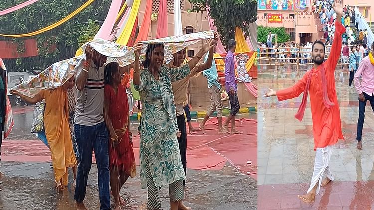 बारिश में नाचने लगे कृष्णभक्त