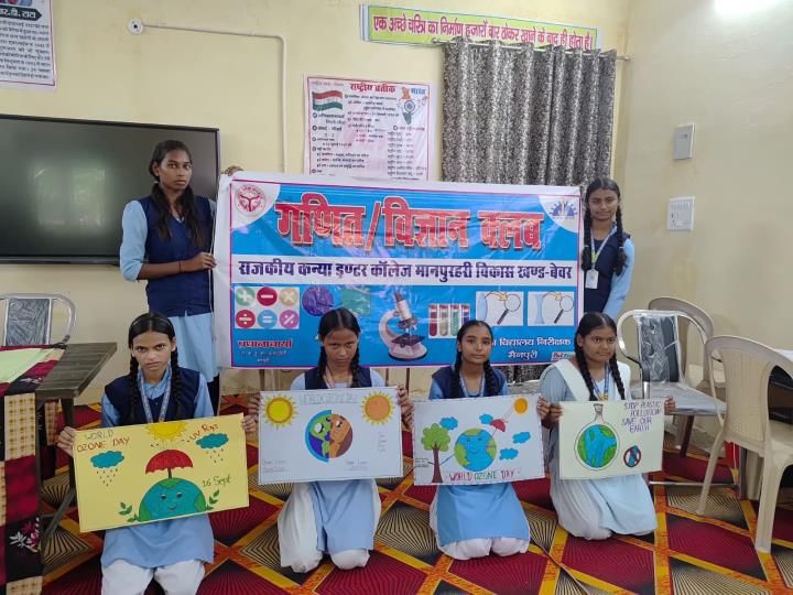 राजकीय कन्या इंटर कालेज मानपुर हरी में पोस्टर के साथ छात्राएं।