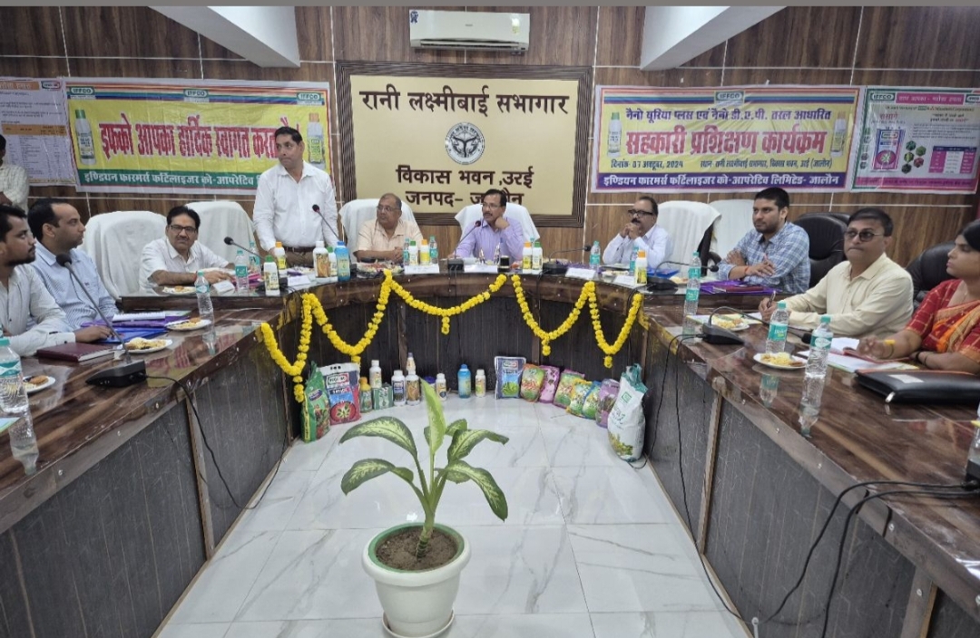 (उरई जालौन) उरई: जालौन जिलाधिकारी राजेश कुमार पाण्डेयजी ने विकास भवन के रानी लक्ष्मीबाई सभागार उरई में सहकारी समितियों को Nano Urea and DAP तथा जैव उर्वरक के प्रयोग की विधि उसकी उपयोगिता, किसानो को प्रोत्साहित किये सम्बंध में प्रशिक्षण कार्यक्रम एवं गोष्ठी कार्यक्रम का उद्घाटन किया। गोष्ठी में उपमहाप्रबंधक इफको मुख्यालय लखनऊ यतेंद्र तेवतिया ने Nano Urea / DAP एवं जैव उर्वरक की उपयोगिता, उपयोग विधि एवं भविष्य में होने वाले लाभों से गोष्ठी में अवगत कराया गया। जालौन जिलाधिकारी राजेश कुमार ने सभी बी. पैक्स के सचिवों को निर्धारित मूल्य पर रसायनिक उर्वरक उपलब्ध कराने के साथ-साथ मृदा परीक्षण के अनुसार निर्धारित मात्रा में उर्वरक के उपयोग करने एवं पर्यावरण तथा आमजन के हित में Nano Urea, DAP के प्रयोग को प्रोत्साहित करने के लिये कहा।