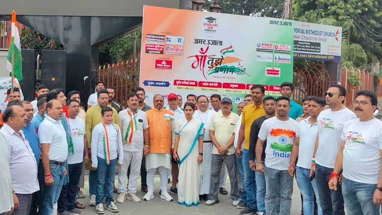 मुरादाबाद में अमर उजाला के अभिनव अभियान मां तुझे प्रणाम के तहत शुक्रवार 15 अगस्त को सामूहिक राष्ट्रगान हुआ। पीलीकोठी चौराहा पर सुबह 8:30 बजे हूटर बजने के साथ ही सामूहिक राष्ट्रगान में बड़ी संख्या में नागरिकों की मौजूदगी रही।
