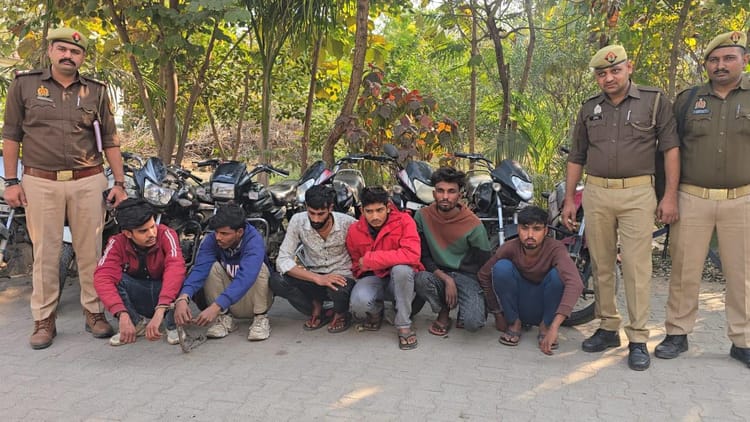 एसपी (सिटी) प्रीति सिंह ने बताया कुछ महीनों से बाइक चोरी के कई मामले सामने आए। पुलिस इस गिरोह का सुराग लगाने में जुटी थी। बुधवार रात सुराग मिलने पर पुलिस कोछा भावर के तालाबपुरा स्थित तालाब की पुलिया के पास पहुंची। यहां से कुछ युवकों को घेरकर पकड़ा गया। पूछताछ में चोरों के बड़े गिरोह का पता चला। गिरोह में शामिल सभी बदमाशों की उम्र 18-20 साल के बीच की है। इनमें प्रेमनगर के हंसारी मोहल्ला निवासी अभय राजा (19) उर्फ मोगली वाल्मीकि , सीपरी बाजार के पाल कॉलोनी निवासी रविंद्र पाल (20), नवाबाद के जेडीए कॉलोनी निवासी अजय खटीक (18), एरच के अचौसा गांव निवासी जयपाल (19) उर्फ मोनू पाल एवं सोमिल चौधरी (20), शिवपुरी (मप्र) निवासी मनोहर परिहार (20), समेत 14 वर्षीय बाल अपचारी शामिल है वहीं, पिछोर निवासी यस्सू भारती पुलिस को चकमा देकर भाग निकला। इन सभी के खिलाफ नवाबाद, सीपरी बाजार, एरच आदि थानों में कुल 38 मामले दर्ज हैं। पकड़े गए बदमाशों की निशानदेही पर पुलिस ने वहां छिपाकर रखी ग्यारह मोटर साइकिल बरामद की। उनके पास से दो तमंचा एवं ऑटो बरामद किया। ऑटो का इस्तेमाल भी चोरी में करते थे। पुलिस टीम में नवाबाद थाना प्रभारी रवि श्रीवास्तव, विश्वविद्यालय चौकी प्रभारी निखिल कुमार, पवन प्रजापति, अजय यादव समेत अन्य मौजूद थे।