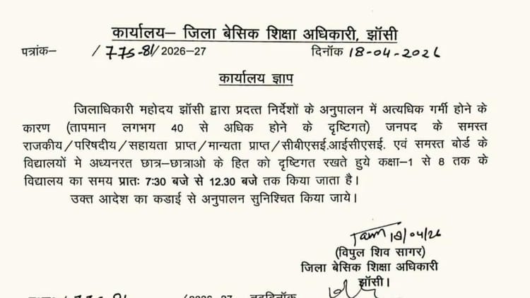 अप्रैल में ही बुंदेलखंड खूब तप रहा है। शनिवार को झांसी देश का 10वां सबसे गर्म शहर रहा। मौसम विभाग ने अगले हफ्ते झांसी का दिन का पारा 45 डिग्री सेल्सियस तक पहुंचने के आसार जताए हैं। ऐसे में स्कूली बच्चों की सेहत और सुरक्षा को देखते हुए प्रशासन ने विद्यालयों के समय में बदलाव करने का फैसला लिया है। सोमवार, 20 अप्रैल 2026 से कक्षा 1 से कक्षा 8 तक के सभी स्कूल सुबह 07:30 बजे से दोपहर 12:30 बजे तक ही संचालित होंगे। यह आदेश जनपद के समस्त परिषदीय विद्यालय, सहायता प्राप्त और मान्यता प्राप्त स्कूल, सीबीएसई, आईसीएसई और अन्य सभी बोर्डों के स्कूलों के लिए है।