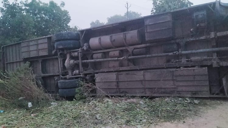 हादसे के बाद सड़क किनारे पलटी बस – फोटो : अमर उजाला