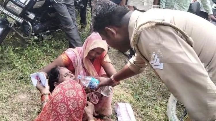 घायल महिला किसान को पानी पिलाता जवान