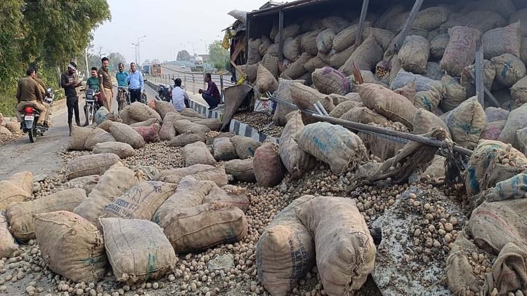 आलू लदा ट्रक पलटा