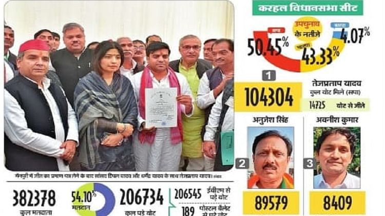 करहल में राउंडवार मतगणना का परिणाम सामने आ गया है। करहल के पंचवटी में खिला कमल, करहल में दौड़ी साइकिल।