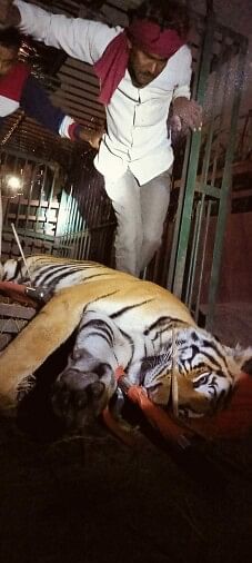 बासुकपुर गांव में पिंजरे में कैद हुई हमलावर बाघिन।