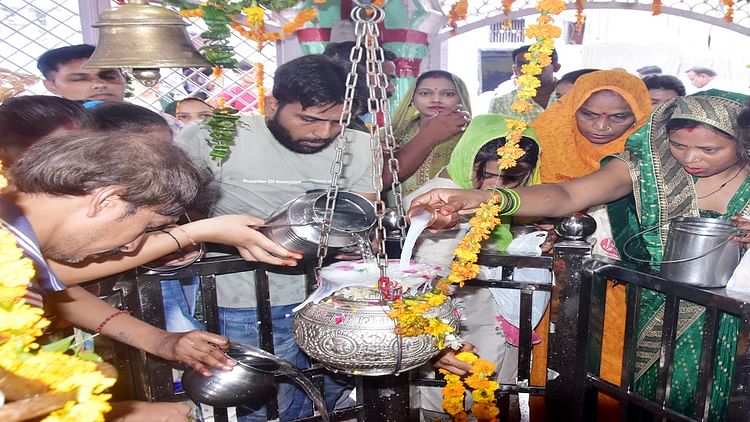अचलेश्वर मदिंर में जलाभिषेक करते शिवभक्त