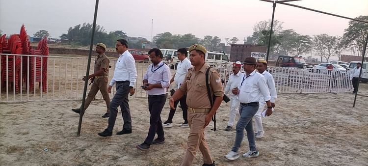 सीएम योगी के आगमन की तैयारियां जांचते अधिकारी।