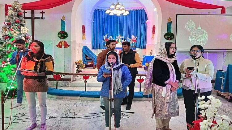 घंटाघर स्थित चर्च ऑफ असेंसन में प्रार्थना सभा में गीत गाते युवक युवतियां