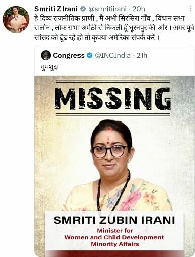 सलोन (रायबरेली)। केंद्रीय मंत्री स्मृति ईरानी और कांग्रेस के बीच ट्विटर पर रार शुरू हो गई है। कांग्रेस ने ट्विटर पर पोस्टर जारी करके स्मृति ईरानी को गुमशुदा लिख दिया। इस पर केंद्रीय मंत्री ने कांग्रेस के पूर्व राष्ट्रीय अध्यक्ष राहुल गांधी पर तंज कसा और लिखा अगर पूर्व सांसद को ढूंढ रहे हो तो कृपया अमेरिका संपर्क करो। कांग्रेस ट्विटर पर पोस्टर डालकर बताना चाहती है कि केंद्रीय मंत्री स्मृति ईरानी अपने लोकसभा क्षेत्र अमेठी कई दिनों से नहीं गई हैं। यह हाल तब है, जब स्मृति ईरानी अपने संसदीय क्षेत्र के दो दिवसीय दौरे पर रहीं। कांग्रेस के ट्विटर पर पोस्टर डालकर स्मृति ईरानी को गुमशुदा बताने पर लोग कांग्रेस का मजाक उड़ा रहे हैं।सांसद के इस पलटवार से राजनैतिक हलचल बढ़ गई है। कांग्रेस के ट्विटर हैंडल पर लोग कांग्रेस पर ही निशाना साध रहे हैं। हालांकि यह मामला स्मृति ईरानी के पहले दिन के दौरे यानि बुधवार का है। स्मृति सलोन विधान सभा दौरे के दूसरे और अंतिम दिन बृहस्पतिवार को सिर्फ लोगों से जनसंवाद कार्यक्रम में मिली और उनकी समस्या सुनी। इसके बाद लखनऊ रवाना हो गई।