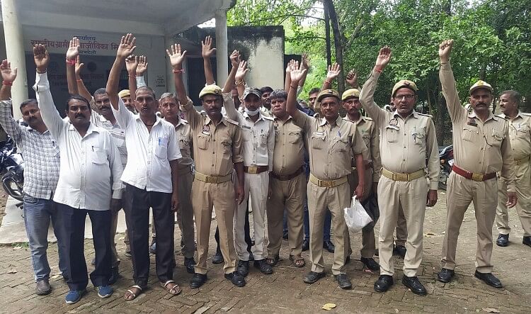 रायबरेली में मंगलवार को विकास भवन में प्रदर्शन करते पीआरडी के जवान।