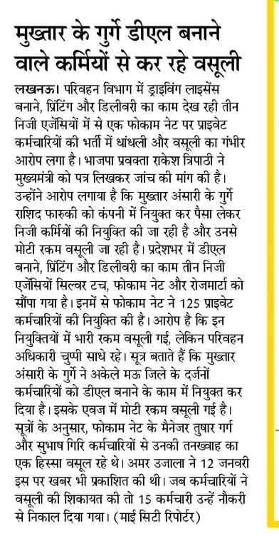 डीएल बनाने वाले प्राइवेटकर्मियों से वसूली में मुख्तार गैंग के सक्रिय होने की 25 जिलों के डीएम करेंगे जांच