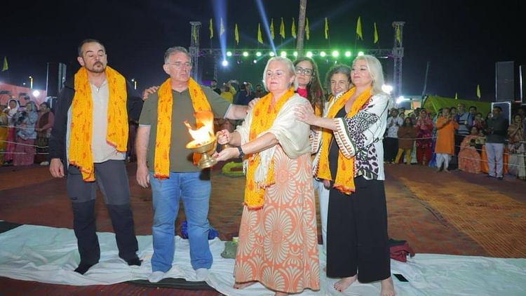 यमुना मैया की महाआरती करते विदेशी सैलानी