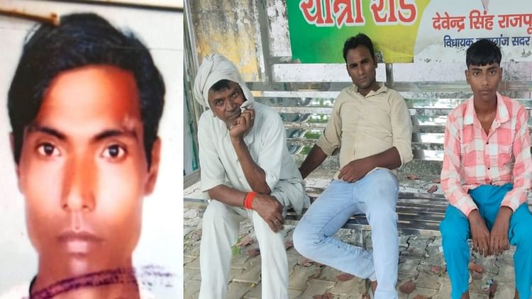 मृतक का फाइल फोटो और पोस्टमार्टम हाउस पर बैठे परिजन