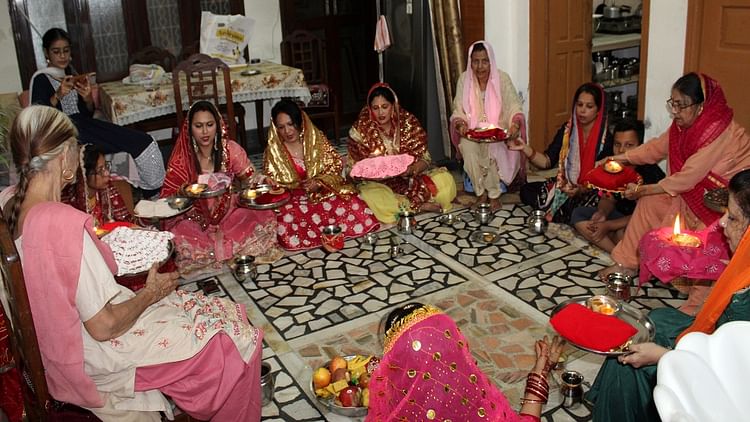 नेहरू कॉलोनी में करवा चौथ की पूजा करतीं महिलाएं