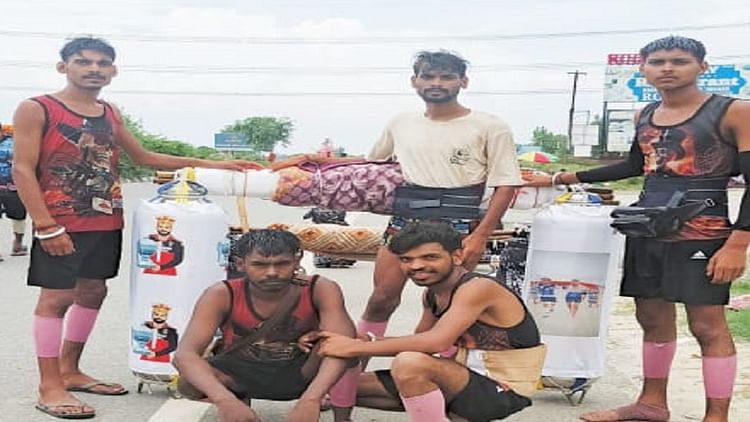 विराट के फोटो वाली कांवड़ के साथ चार दोस्त और एक अन्य युवक।