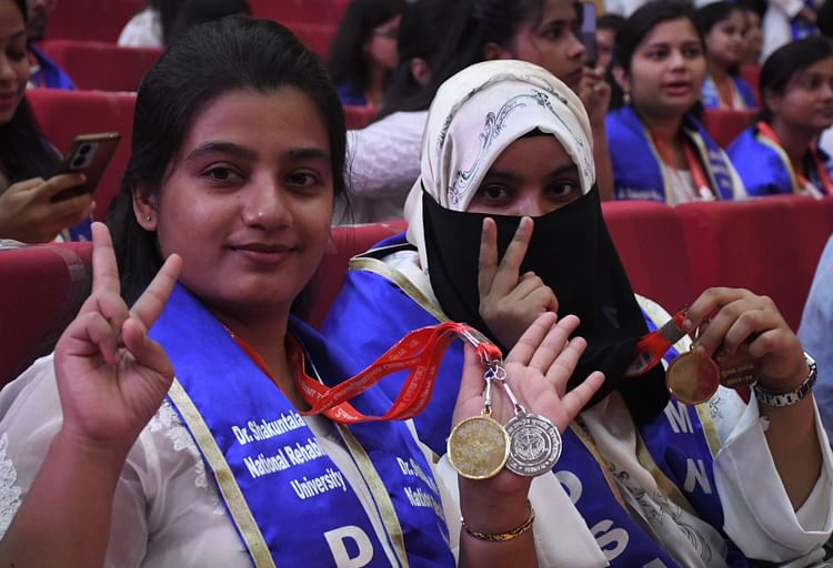 पुनर्वास विवि के दीक्षांत समारोह में मेडल पाकर उत्साहित छात्राएं।