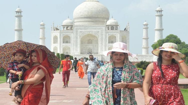 ताजमहल पर तेज धूप व गर्मी से परेशान दिखे पर्यटक।
