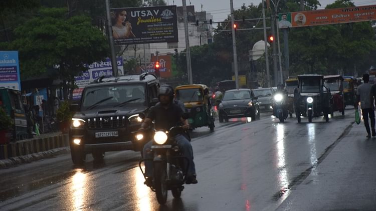 मुरादाबाद में बारिश के दौरान वाहन चलाते लोग