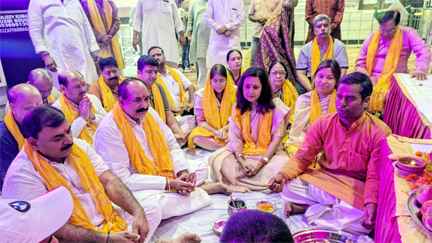 प्रत्येक वर्ष की भांति इस वर्ष भी नई मन्डी क्षेत्र की भरतिया कालोनी स्थित श्री गणपति खाटू श्याम मंदिर में श्री गणपति महोत्सव बडी धूमधाम के साथ मनाया जा रहा है। 07 सितम्बर से लेकर 15 सितम्बर 2024 तक मनाए जाने वाले श्री गणपति महोत्सव के धार्मिक कार्यक्रमों की कडी में आज प्रातः मंदिर परिसर मे विद्वान आचार्यो द्वारा श्री गणपति महाराज का पूजन कराया गया। श्री गणपतिधाम खाटू श्याम मंदिर के संस्थापक अध्यक्ष समाजसेवी भीमसैन कंसल एवं अन्य पदाधिकारियों द्वारा अतिथियों पालिकाध्यक्ष श्रीमति मीनाक्षी स्वरूप, उद्यमी रघुराज गर्ग, पूर्व विधायक अशोक कंसल, उद्यमी नरेन्द्र गोयल, व्यापारी नेता संजय मित्तल आदि को पटका पहनाकर उनका स्वागत किया।