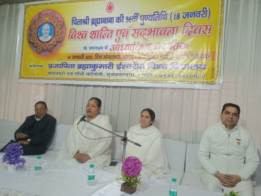 Muzaffarnagar के पचेड़ा रोड स्थित बारात घर में प्रजापिता ब्रह्माकुमारी ईश्वरीय विश्वविद्यालय के साकार संस्थापक पिता श्री ब्रह्मा बाबा की 56वीं पुण्यतिथि के उपलक्ष्य में एक विशेष आध्यात्मिक कार्यक्रम का आयोजन किया गया। यह आयोजन ब्रह्माकुमारीज के केशव पुरी और गांधी कॉलोनी सेवा केंद्रों द्वारा संयुक्त रूप से किया गया। कार्यक्रम में विशेष अतिथि के रूप में वरिष्ठ अधिवक्ता अशोक कुमार डोडा उपस्थित रहे, जिन्होंने अपने उद्बोधन में कहा कि ब्रह्माकुमारी संस्था से जुड़कर ही व्यक्ति अपने जीवन को विकारों से मुक्त कर सकता है।