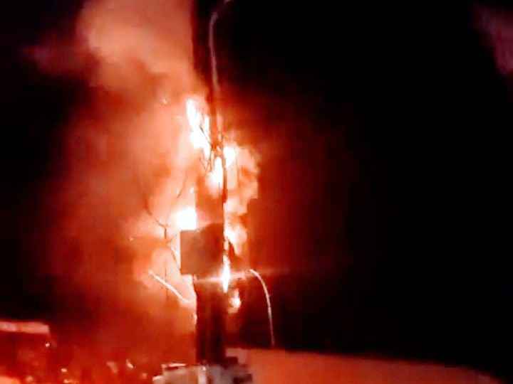 कुछ ही पलों में तारों में आग लग गई और चिंगारियां गिरने लगीं। देखते-देखते पूरा बिजली का खंभा आग की लपटों से घिर गया। आसपास खड़े लोग सहम गए और स्थिति नियंत्रण से बाहर होती नजर आने लगी।