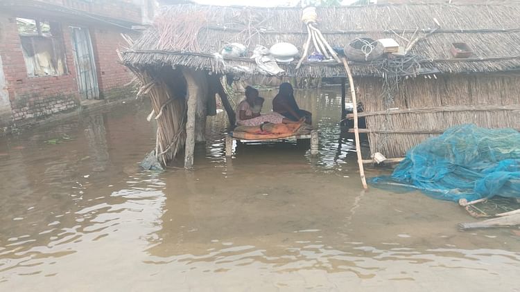 बिजुआ ब्लॉक के करसौल गांव में बाढ़ के पानी से घिरे घर