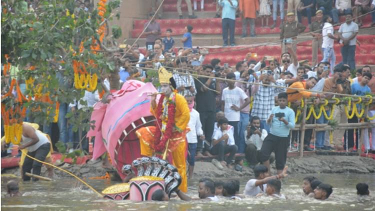 भगवान श्रीकृष्ण अपने सखाओं के साथ गेंद खेल रहे थे तभी गेंद यमुना में चली गई। भगवान श्रीकृष्ण ने कदंब के पेड़ पर चढ़कर बांसुरी बजाई और अचानक गंगा में छलांग लगा दी।