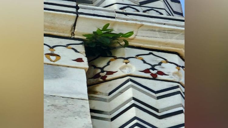ताजमहल के मुख्य गुंबद की संगमरमरी दीवार पर उग आया पौधा
