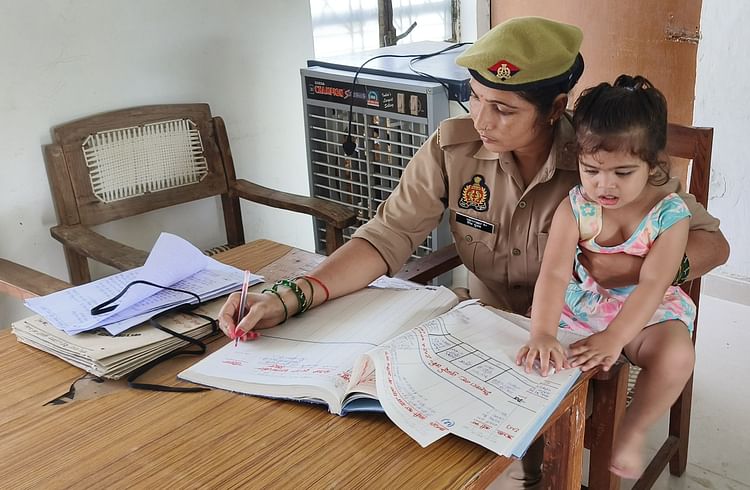 पुलिस कार्यालय में बेटी को गोद में लेकर ड्यूटी करती आरक्षी रिचा शुक्ला।