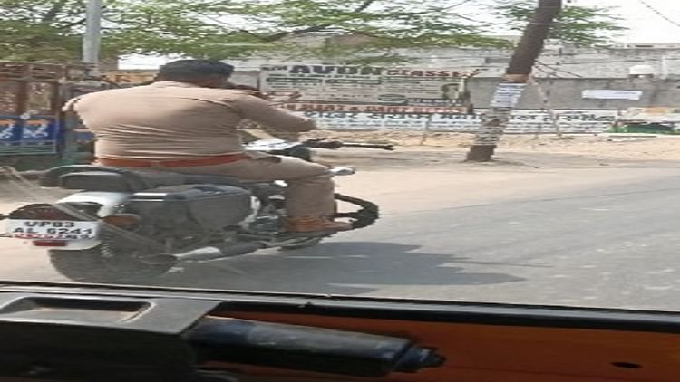 बिना हेलमेट के बाइक पर मोबाइल से बात करते हुए पुलिसकर्मी