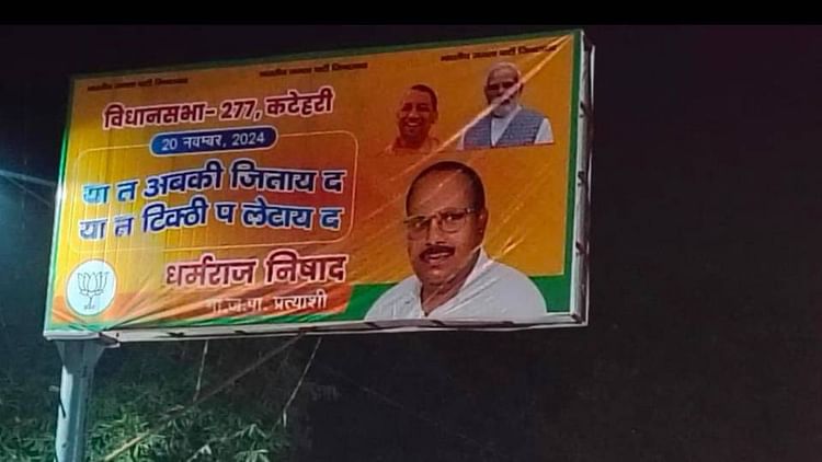 उत्तर प्रदेश में इन दिनों उपचुनाव को लेकर राजनीतिक सरगर्मियां तेज हैं। इस बार के उपचुनाव में पोस्टर वार भी खूब देखने को मिल रहा है। अंबेडकरनगर में कटेहरी विधानसभा सीट पर भी उपचुनाव होना है। यहां से बीजेपी प्रत्याशी पूर्व मंत्री धर्मराज निषाद का एक पोस्टर वायरल हो रहा है। उनकी क्षेत्र में एक अपील करते हुए होर्डिंग लगी है। इसमें लिखा है ‘या तो अबकी जिताय दा… या फिर टिकठी पर लिटाय दा’।