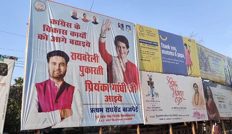 पोस्टर पर लिखा है कि रायबरेली से चुनाव लड़ें और विकास कार्यों को आगे बढ़ाएं।