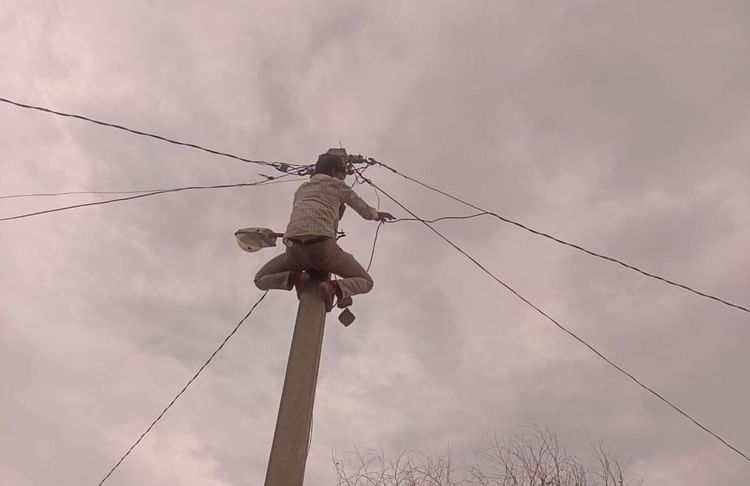 खंभे पर बिजली के तार दुरुस्त करता कर्मी