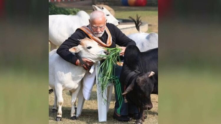 गौसेवा करते पीएम नरेंद्र मोदी।
