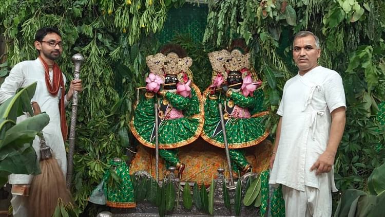 नंदगांव के प्रसिद्ध नंदबाबा मंदिर में फूल पत्तियों से सुसज्जित रजत हिंडोले में झूलते कृष्ण बलराम