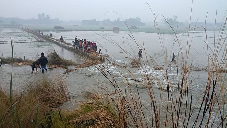 शारदा नहर की पटरी कटने से खेतों में भरा पानी।