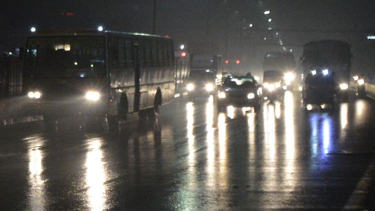 बारिश के बीच हाईवे से गुजरते वाहन।